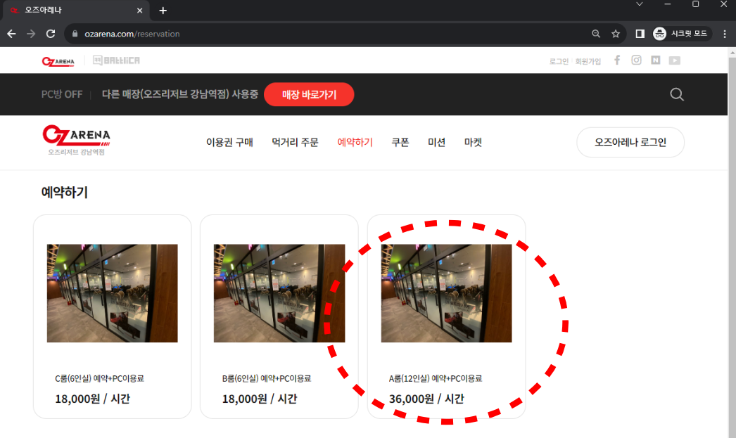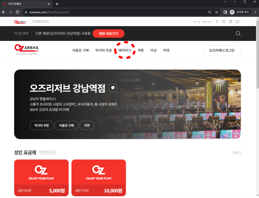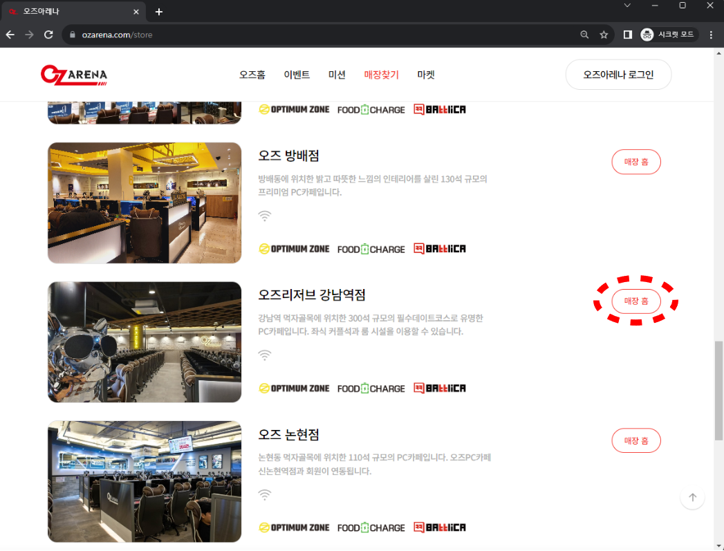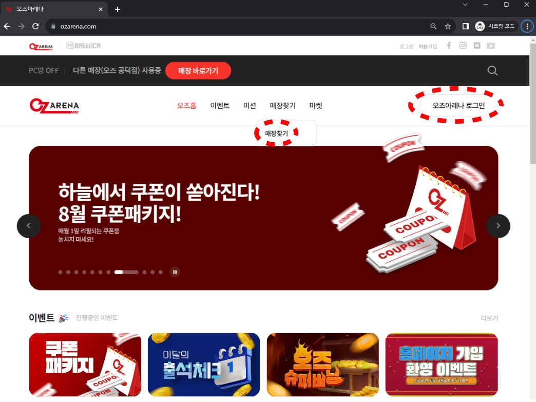 오즈아레나 홈페이지와 옵티멈존 PC카페 매장 이용에 관한 FAQ입니다.1. 오즈아레나 홈페이지 로그인 후 상단 '매장찾기' 메뉴 클릭