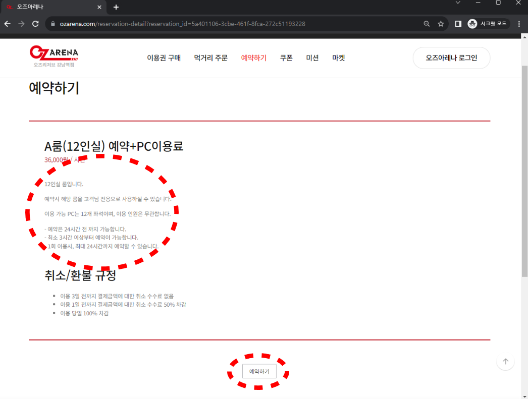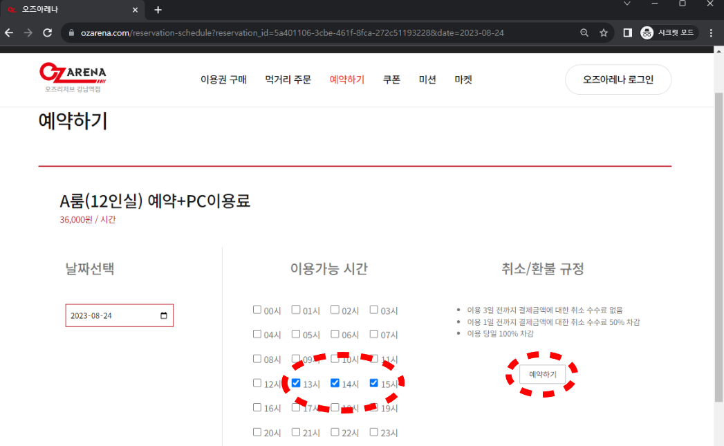 6. 예약할 시간 체크 후 '예약하기' 클릭, 결제 진행