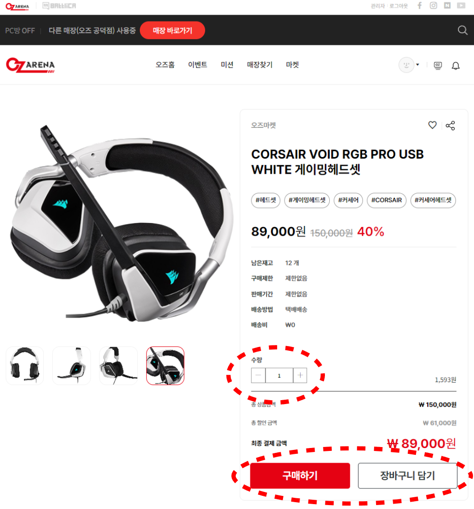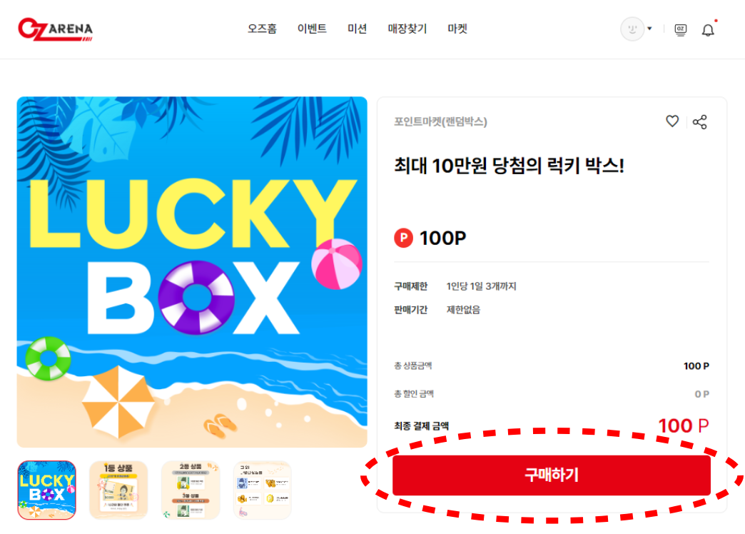 1. 오즈아레나 홈페이지 '상단 마켓 메뉴, 이벤트 배너, 상품 썸네일' 중 클릭