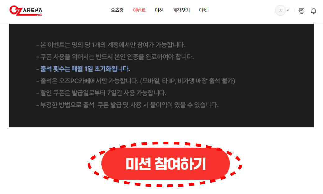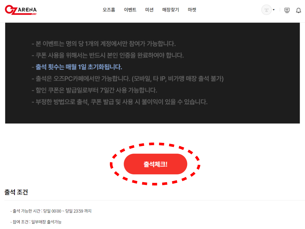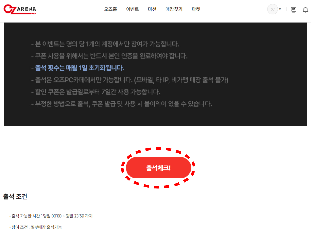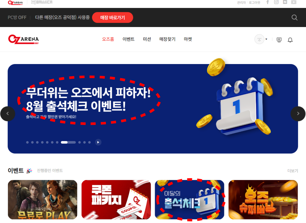 오즈아레나 홈페이지와 옵티멈존 PC카페 매장 이용에 관한 FAQ입니다.1. 오즈아레나 메인 홈페이지에서 출석하는 방법