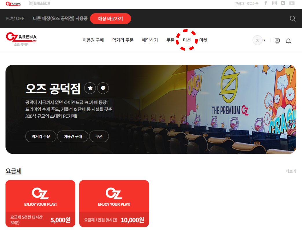 1. 오즈아레나 매장 홈페이지 로그인 후 '미션' 클릭