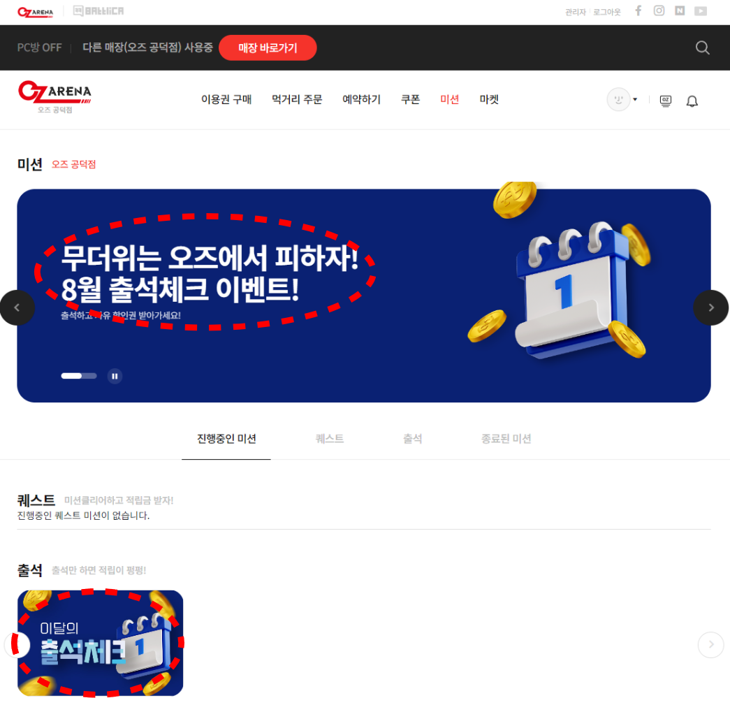 2. 오즈아레나 매장 홈페이지에서 출석하는 방법