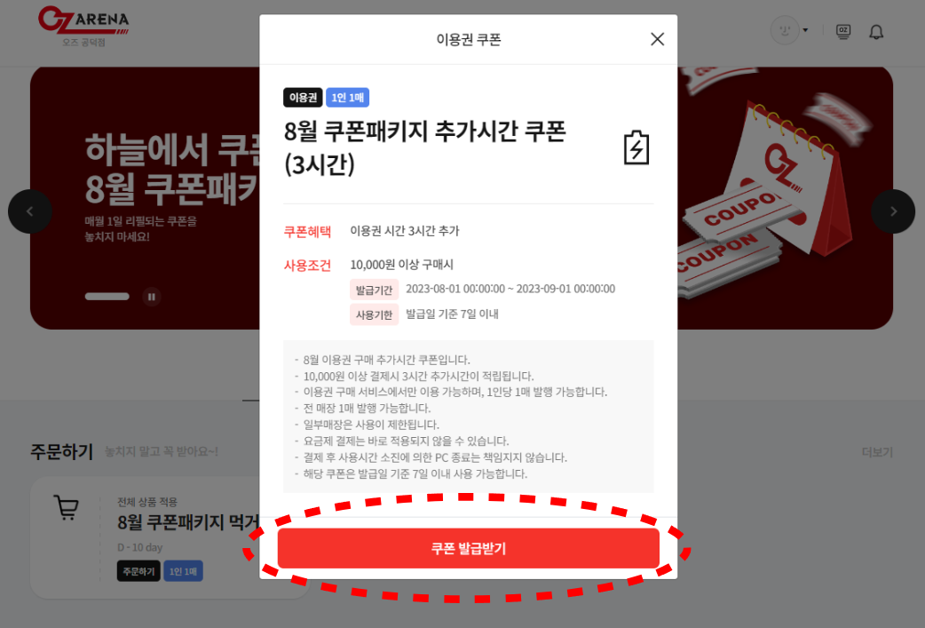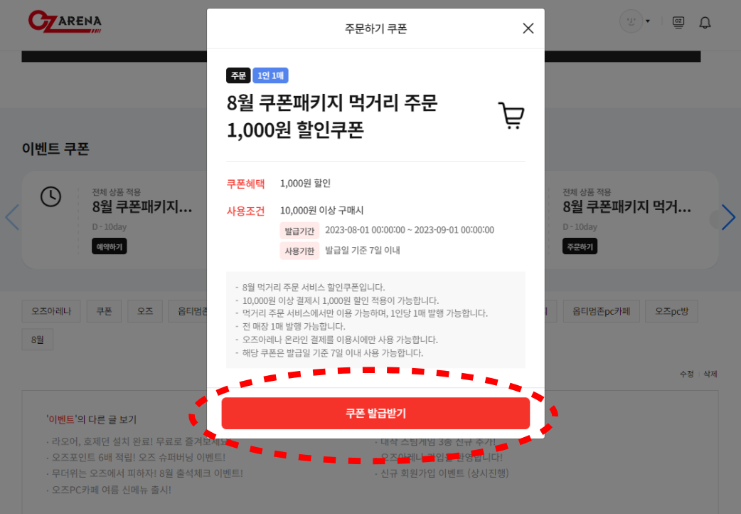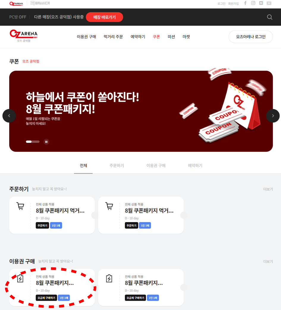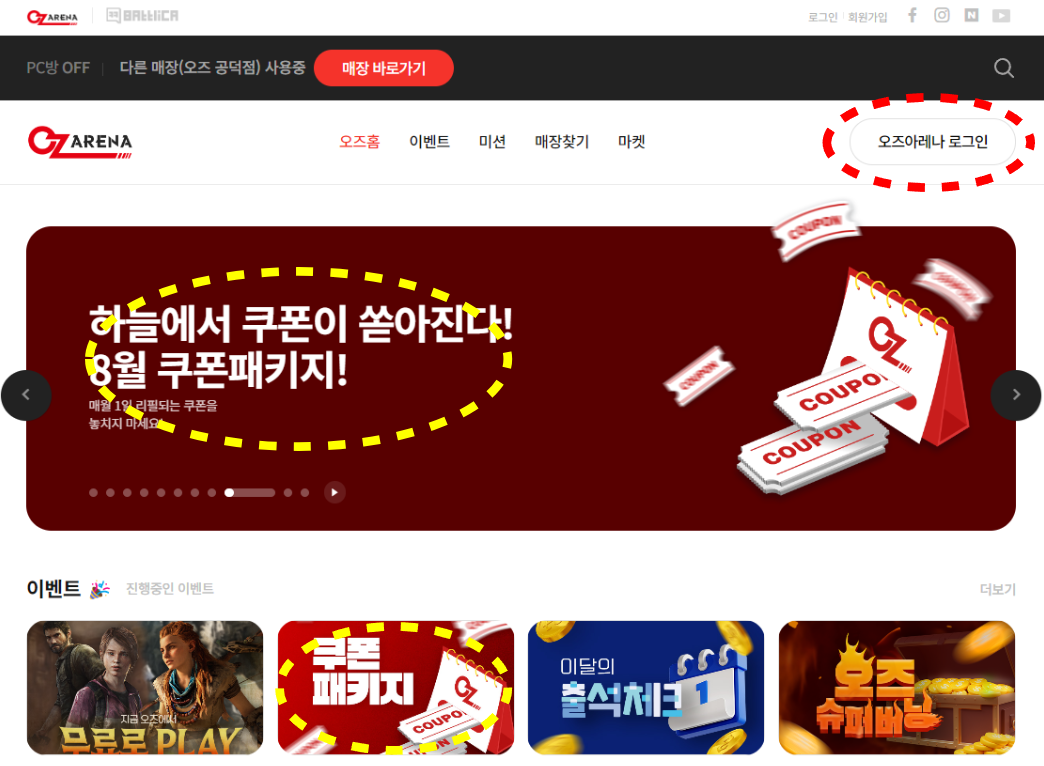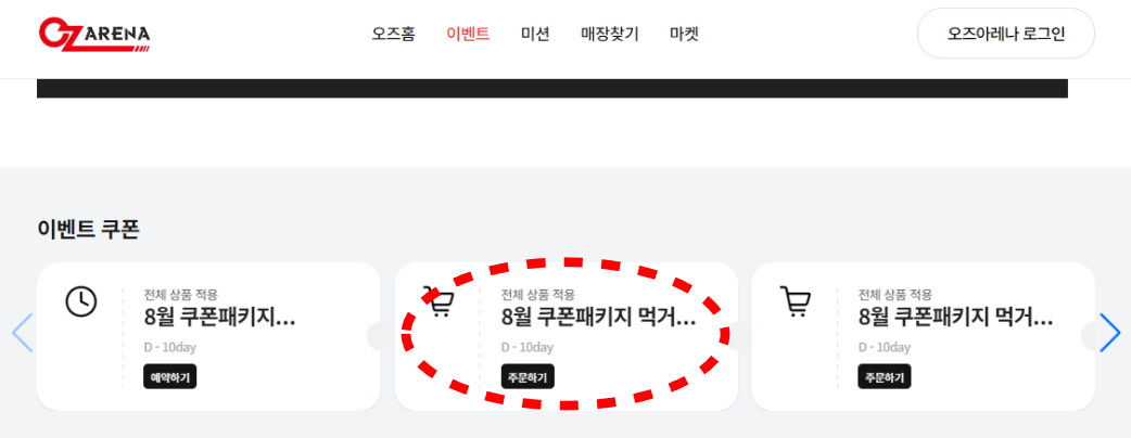 1. 오즈아레나 홈페이지 로그인 후 '쿠폰패키지 이벤트 배너 혹은 썸네일' 클릭