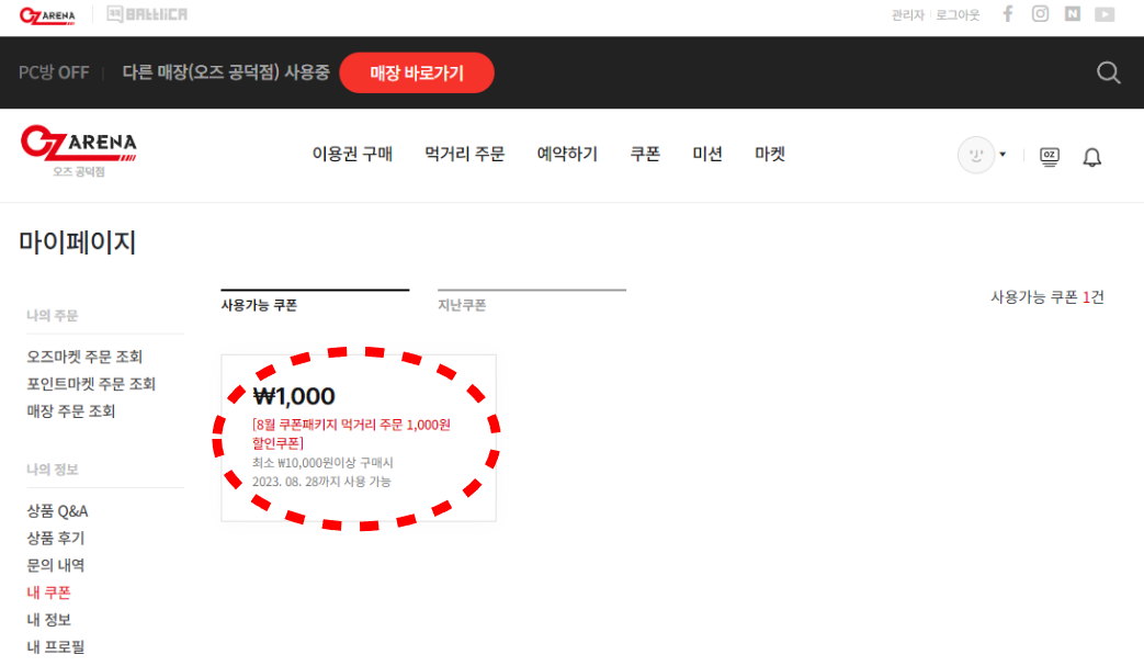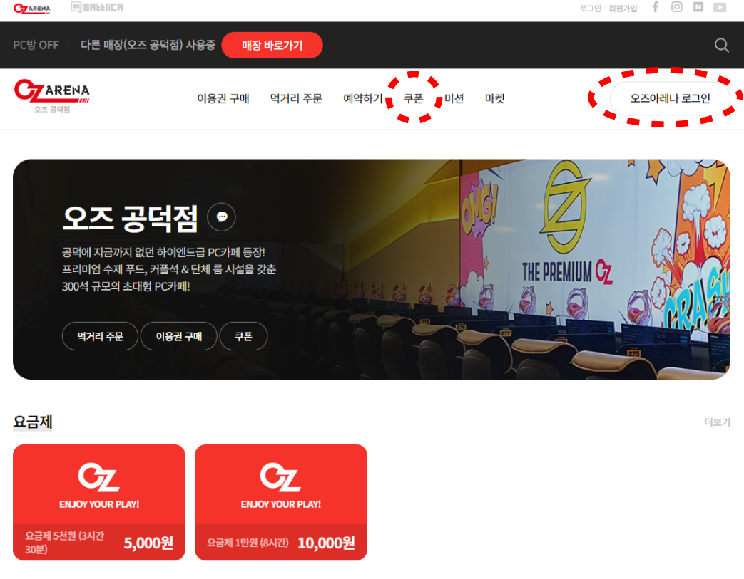 1. 오즈아레나 로그인 후 매장 홈페이지 상단 '쿠폰' 메뉴 클릭